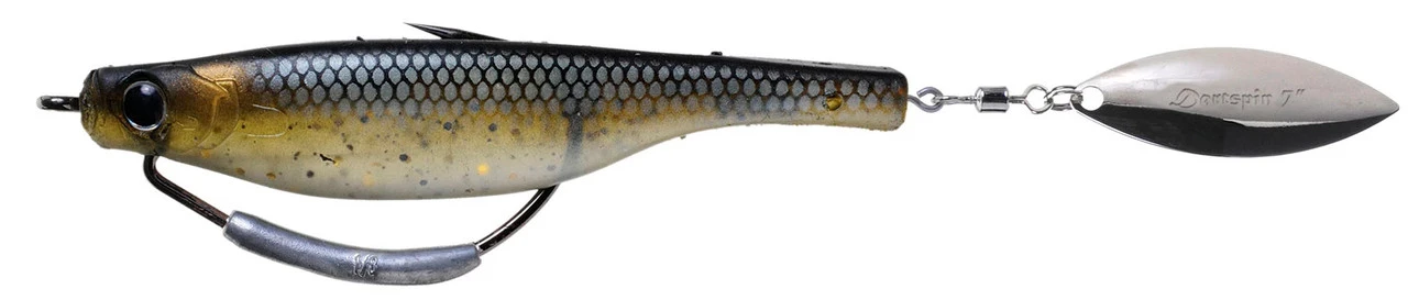 The Hyperlastics Dartspin Pro 7in Weedless Lure is a tough, durable, bladed softbait that has been hand painted to mimic various prey. It has a minnow shaped body with a willow blade solidly embedded into its tail. The Dartspin Pro comes pre-rigged on a weighted, weedless hook.